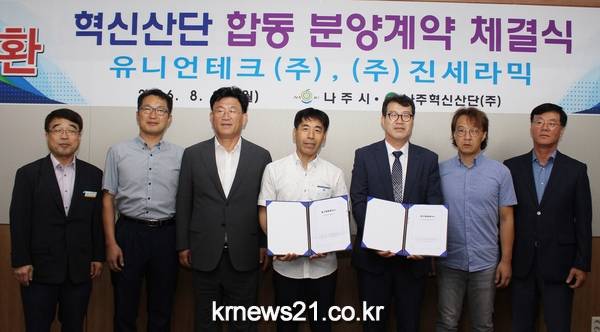 나주시는 29일 오전 시청 소회의실에서 경기도 평택에 본사를 둔 유니언테크, 신규법인 진세라믹 등 2개 업체와 혁신산단 입주 합동 분양계약을 체결했다