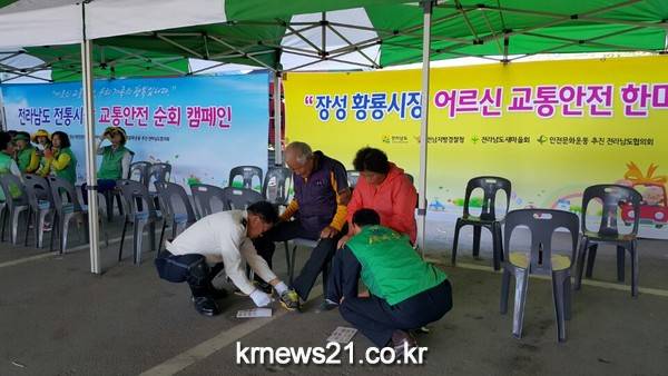 전라남도 도민안전실과 장성군청 공직자, 장성경찰서, 장성군새마을회 회원 등 30여 명은 500여 명의 어르신들에게 교통안전 신발 반사지, 이륜차 반사지 등을 붙여주기도 하고, 그룹별로 마을별 사고 사례, 교통안전수칙에 대해 얘기를 나누며 세심한 홍보활동을 펼쳤다.