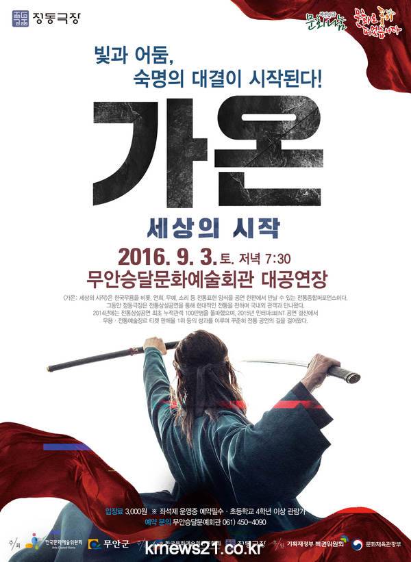 무안군(군수 김철주)은 오는 9월3일(토) 저녁 7시30분에 승달문화예술회관 대공연장에서 국립예술단체인 정동극장의 ‘가온 : 세상의 시작’공연을 개최한다.