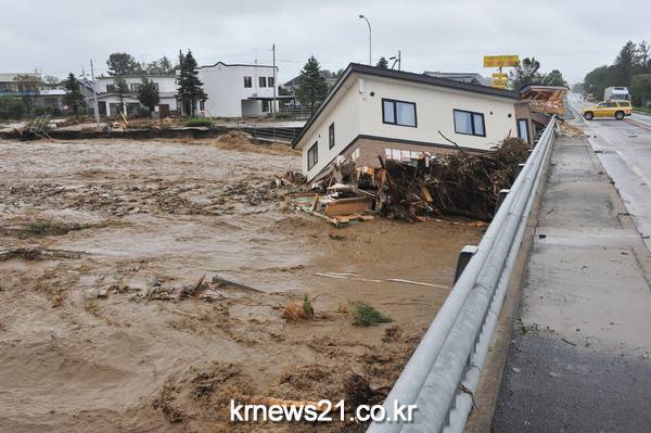 ▲ 31일 제10호 태풍 `라이언독` 영향으로 홋카이도 현 시미즈 마을에서 강에 떠밀려온 주택. TOKACHI MAINICHI / JIJI PRESS / AFP[제공자ⓒ 뉴스21통신. 무단전재-재배포 금지.]제10호 태풍 '라이언독'이 일본 열도를 통과한 영향으로 한 노인 요양시설에서 9명이 숨진 채 발견됐다고 일본 경찰은 밝혔다.