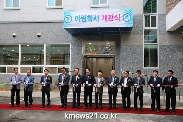 이날 집체 교육이 끝난 뒤, 참석자들은 한국승강기대학교가 숙원 사업으로 건립한 제2기숙사 현관 앞에서 개관 테이프를 끊었다.