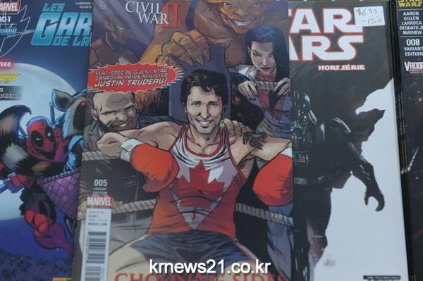 캐나다 몬트리올 가판대 앞에 놓여있는 미국 출판파 마블의 만화책 표지에 저스틴 트뤼도 캐나다 총리를 슈퍼 영웅으로 그려져 있다.