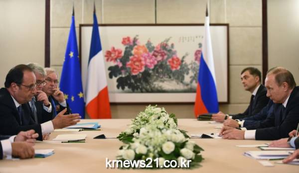 G20 항저우 정상회담 중 블라디미르 푸틴 러시아 대통령과 프랑수와 올랑드 프랑스 대통령이 회담을 하고 있다.