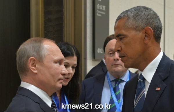 G20 항저우 정상회담에서 만난 블라디미르 푸틴 러시아 대통령(왼쪽)과 버락 오바마 미국 대통령(오른쪽). 양 정상은 5일 시리아 내전과 우크라이나 사태를 논의했으나 합의 도출에는 실패했다.