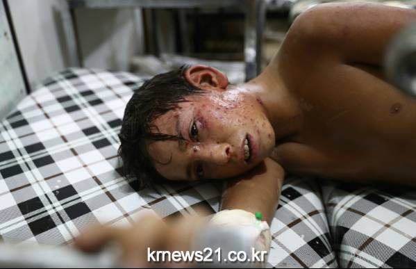 시리아 반군지역 도우마에서 정부의 공습으로 부상당한 시리아 소년이 임시 병원에서 치료를 받은 후 누워서 휴식을 취하고 있다.