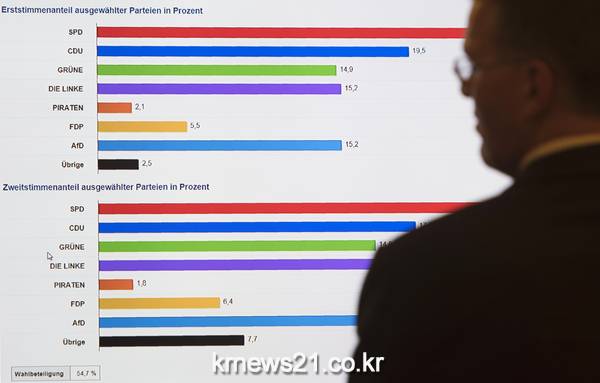 ▲ 베를린 주 의회에서 18일(현지식나) 선거 후 결과표를 보고 있는 한 남성. 앙겔라 메르켈 독일 총리의 개방 난민 정책에 분노를 활용해 우익 포퓰리즘 정당인 `독일을 위한 대안`이 새로운 지지를 얻고 있는 반면 메르켈의 기독민주당은 역대 최악의 득표율을 받았다. STEFFI LOOS / AFP[제공자ⓒ 뉴스21통신. 무단전재-재배포 금지.]앙겔라 메르켈 총리가 속한 기독민주당(CDU)은 독일 베를린이 통일된 이래 26년만에 가장 나쁜 성적을 받았고, 반(反)이슬람·반(反)유로의 우익 포퓰리즘 정당 '독일을 위한 대안(Alternative fuer Deutschland·AfD)이 수도 베를린시의회에 입성하게 됐다.