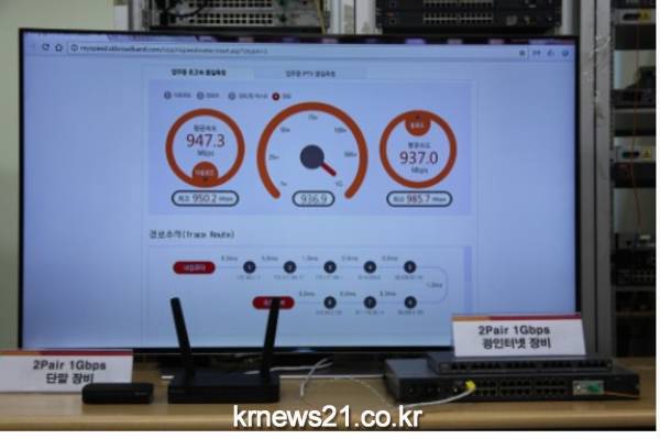 SK브로드밴드(대표 이인찬)가 케이블의 추가 증설없이 아파트 건물에 시설된 기존 케이블 2페어(4가닥)를 활용해 상하향 각각 최대 1Gbps 인터넷 속도 제공이 가능한 솔루션을 세계 최초로 개발했다고 21일 밝혔다. 2010년 이전에 시설된 대부분의 아파트는 가구당 2페어(4가닥) 랜케이블만 포설되어 있어, 고객이 1기가 인터넷 서비스를 이용하려면 랜케이블을 4페어(8가닥)로 증설이 필요했다. 하지만 아파트 환경에 따라 건물 내 통신관로 공간이 부족해 랜케이블 증설이 불가능한 경우가 많았다. SK브로드밴드는 이러한 환경적 요인을 극복하고 기가급 서비스를 제공하고자 이미 지난 2013년에 추가 증설없이 랜케이블 2페어로 최대 500Mbps까지 제공 가능한 솔루션을 세계 최초로 개발해 서비스 제공 중에 있다.