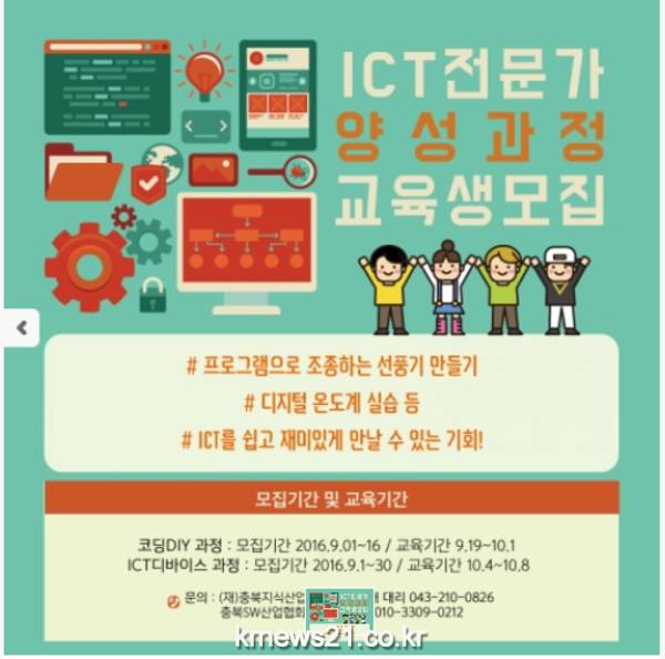 (사)충북소프트웨어산업협회가 (재)충북지식산업진흥원 주관으로 창조경제혁신형 인적 자원 개발을 위한 ‘ICT 전문가 양성과정’이 개최되어 협회가 교육을 진행한다고 밝혔다. 이번 교육은 ‘ICT 디바이스 과정’과 ‘코깅 DIY 과정’으로 각 16명씩 총 32명의 교육생을 모집한다. 교육내용 및 기간은 ICT 디바이스 과정 9월 19일~10월 1일(9/19, 21,24, 26, 10/1), 코딩 DIY 과정 10월 4일~10월 8일(4,5,6,7,8)이며 각 09시~17시까지다. ICT 디바이스 과정은 9월 16일까지, 코딩 DIY 과정은 9월 30일까지 각각 접수를 마감한다.