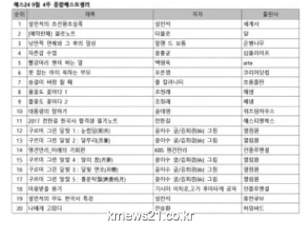 예스24 9월 4주 종합 베스트셀러 순위에서는 한국사 강사 설민석의 <설민석의 조선왕조실록>이 8주째 연속 1위를 이어가고 있다. <설민석의 무도 한국사 특강>은 지난주보다 두 계단 내려간 19위에 머물렀다. 타블로가 MBC 라디오 방송 ‘타블로와 꿈꾸는 라디오’를 진행하며 동명 코너에서 매일 전하던 짧은 글귀를 모아 다듬은 <블로노트>는 예약판매 만으로 단숨에 2위 자리를 꿰찼다. 알랭 드 보통의 신작 <낭만적 연애와 그 후의 일상>은 한 계단 내려가 3위에 자리했다. 자존감 전문가이자 정신과 의사인 윤홍균 원장이 자존감이 우리 삶에 미치는 영향과 자존감을 끌어올리는 실질적인 방법을 알려주는 책 <자존감 수업>은 출간 하자마자 4위로 올라왔다