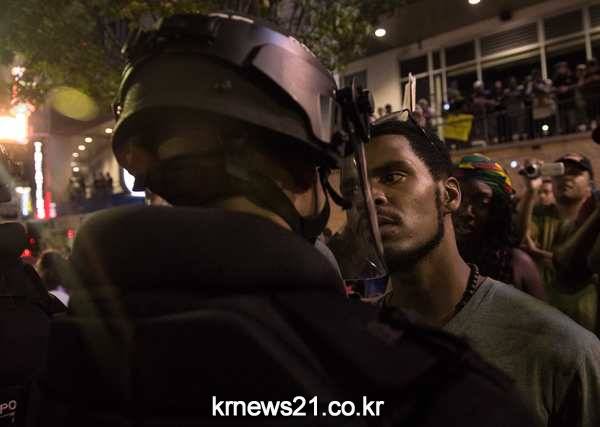 ▲ 미국 노스캐롤라이나 주(州) 샬럿에서 21일(현지시간) 경찰 폭력에 대한 시위 중 진압 경찰을 쳐다보고 있는 한 시위자. NICHOLAS KAMM / AFP[제공자ⓒ 뉴스21통신. 무단전재-재배포 금지.]버락 오바마 미국 대통령은 21일(현지시간) 인종차별 불안이 재점화된 노스캐롤라이나 주(州) 샬럿 시위에 대해 노스캐롤라이나 주(州)의 샬롯 시장과 오클라호마 주(州)의 털사(Tulsa) 시장에게 침착한 대응을 촉구했다.