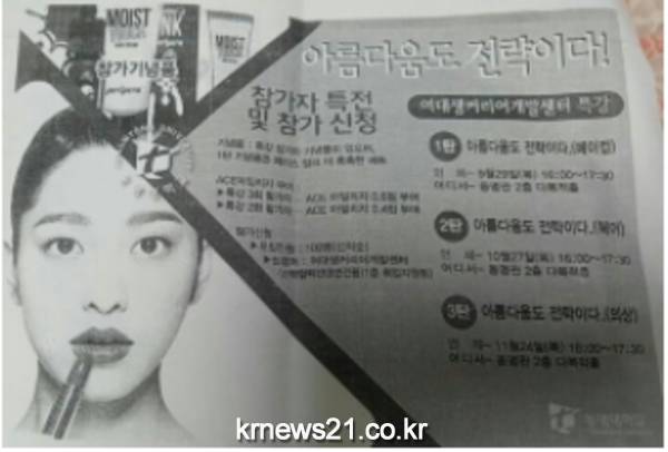 이번 특강은 1탄 메이크업 9월 29일(목) 16:00~17:30 2탄 헤어 10월 27일(목) 16:00~17:30 3탄 의상 11월 24일(목) 16:00~17:30 등의 일정으로 동명관 2층 다목적홀에서 갖는다.