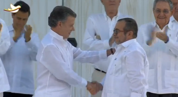 최종 서명 후, 산토스 대통령은 티모첸코 FARC 지도자에게 평화의 상징인 흰색 비둘기 모양의 핀을 건냈다.