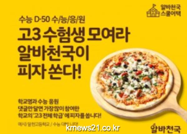 대한민국 대표 아르바이트 구인·구직 포털 서비스 알바천국(대표: 최인녕)은 수능 D-50을 맞아 고3 수험생들을 응원하기 위해 피자를 간식으로 전달하는 ‘스쿨어택’ 이벤트를 진행한다고 밝혔다.