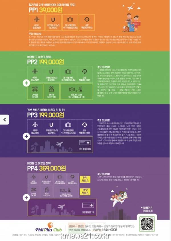 PP3는 PP2와 동일한 가격으로 PP1의 기본 서비스에 한국-필리핀 왕복 항공권을 1매 더 제공하여 2명의 완벽한 에어텔을 구성할 수 있고, PP4는 PP1부터 PP3까지 모두 합친 상품으로 369,000원이다.