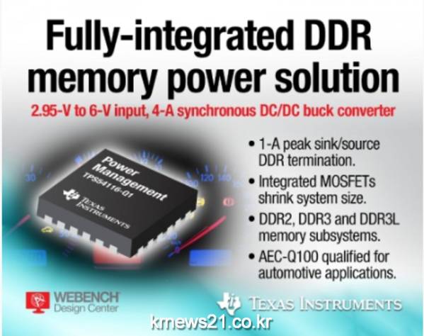 TI 코리아(대표이사 탄즈위멍)가 업계 최초로 오토모티브 및 산업용 애플리케이션의 DDR(double data rate)2, DDR3, DDR3L 메모리 서브시스템을 위한 완전 통합형 전원 관리 솔루션을 출시한다고 밝혔다.