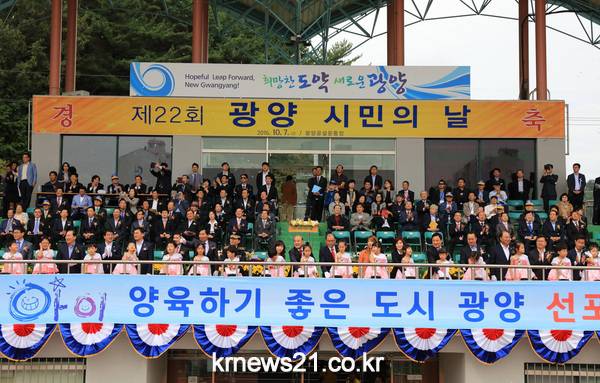 광양시는 10월 7일(금) 오전 10시 광양공설운동장에서 가진 제22회 광양시민의 날 행사 기념식에서 ‘아이 양육하기 좋은 도시’ 선포식을 가지고 시정의 역량을 집중하기로 했다.