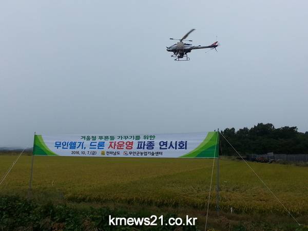 전라남도는 7일 무안 일로읍 망월들에서 농업인과 공무원 등 150여 명이 참석한 가운데 무인헬기와 드론을 활용한 자운영 파종 연시회를 개최했다.