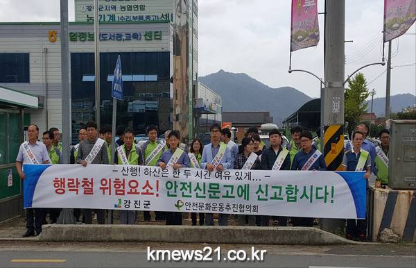 강진원 강진군수는 “본격적인 가을 행락철을 맞아 산행전ㆍ후 준비운동을 철저히 하고 영농철을 맞아 경운기ㆍ트랙터 등 농기계 안전사고에 주의해 달라”며 재해로부터 사전예방에 다함께 참여해 줄 것을 당부했다.