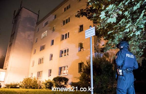 ▲ 보호복을 입은 독일 경찰이 10일(현지시간) 독일 동부에 위치한 폭탄 테러범의 아파트 자택 앞에 서 있다. 경찰은 용의자의 자택에서 폭발물 수백 그램(g)을 발견했다. Jens-Ulrich Koch / AFP[제공자ⓒ 뉴스21통신. 무단전재-재배포 금지.]독일 베를린 공항에 폭탄 테러를 계획했던 시리아인이 10일(현지시간) 다른 시리아인 3명에 의해 붙잡혀있다 경찰에 체포 됐다고 독일 정보기관이 밝혔다.