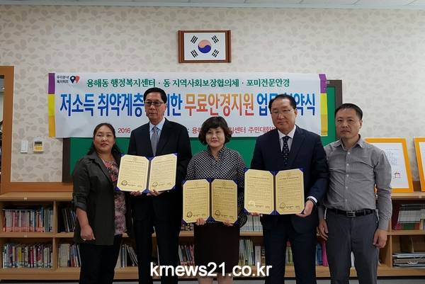 용해동(동장 김혜란), 동 지역사회보장협의체, 포미전문안경점은 11일 동 지역사회보장협의체 특화사업인 저소득 취약계층을 위한 무료안경지원 업무협약을 체결했다.