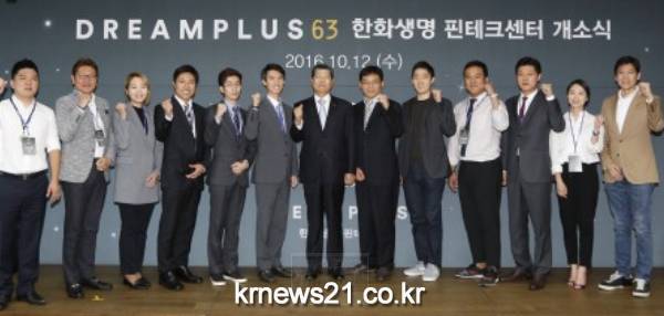 한화생명이 12일(수) 오후 63빌딩에서 핀테크(Fintech) 육성센터인 ‘드림플러스 63 한화생명 핀테크센터(DREAMPLUS 63)’ 출범을 알리는 개소식을 실시했다. 이번 핀테크센터 출범을 통해 한화생명은 청년창업 지원 및 핀테크 생태계 활성화를 위한 새로운 형태의 사회공헌활동을 본격화한다.