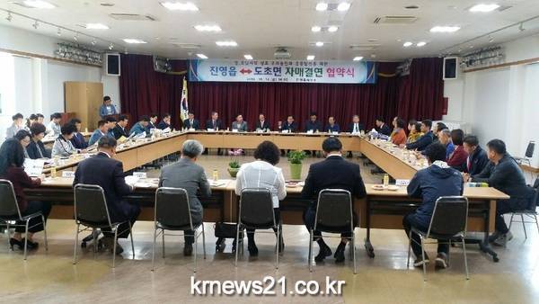 전남 신안군 도초면과 경남 김해시 진영읍은 10월 14일(금) 14:00 진영읍 대회의실에서 양 지역의 도의원, 시의원, 사회단체장, 주민 등 100여명이 참석한 가운데 영·호남 지역의 교류증진과 공동발전을 위한 자매결연 협약을 체결하였다.