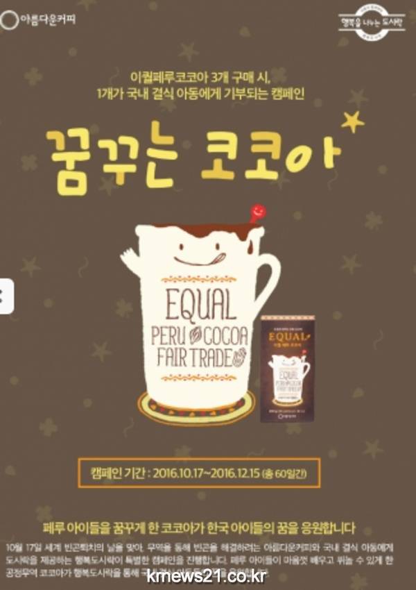 UN(국제연합)이 공인한 세계 빈곤 퇴치의 날(10월 17일)을 맞아 공정무역 아름다운커피(이사장 심상달)와 행복도시락 협동조합(이사장 한경이, 이하 행복도시락)이 12월 15일까지 총 60일간 ‘꿈꾸는 코코아’ 캠페인을 진행한다.