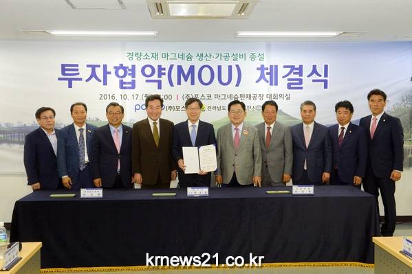 전라남도는 17일 (주)포스코와 순천 해룡산업단지에 오는 2021년까지 1천 230억 원을 투자해 경량소재 마그네슘 생산 및 가공 설비를 증설하는 내용의 투자협약을 체결했다.