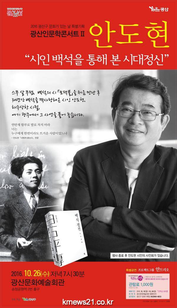 ‘백석 평전’은 시인 백석의 작품과 드라마틱한 생애를 안도현 시인 특유의 감수성 깊은 유려한 문장으로 소설처럼 구성한 작품이라는 게 문단의 평가다. 안도현 시인은 콘서트에서 직접 쓴 평전에 근거해 백석의 다양한 면모를 상세하게 소개할 예정이다. 강연이 끝난 후에는 저자 사인회도 갖는다.
