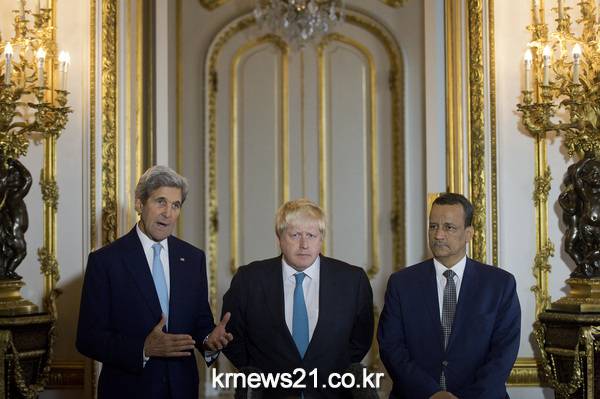 ▲ 미국 국무장관 존 케리, 보리스 존슨 영국 외무장관 그리고 이스마일 울드 체릭 아흐메드 유엔 예멘특사가 16일(현지시간) 런던 랭커스터 하우스에서 예멘의 내전 휴전 촉구 공동 성명을 발표하고 있다. JUSTIN TALLIS / POOL / AFP[제공자ⓒ 뉴스21통신. 무단전재-재배포 금지.]내전을 겪고 있는 예멘에서 첫 휴전이 발효된다고 유엔(UN)이 17일(현지시간) 밝혔다.