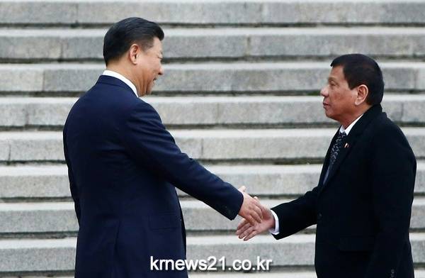 ▲ 중국 베이징에서 20일 로드리고 두테르테 필리핀 대통령(오른쪽)의 방문을 환영하며 악수하고 있는 시진핑 중국 국가주석(왼쪽) THOMAS PETER / POOL / AFP[제공자ⓒ 뉴스21통신. 무단전재-재배포 금지.]로드리고 두테르테 필리핀 대통령이 중국을 방문한 가운데 오늘(20일) 시진핑 주석과 정상회담을 갖는다.