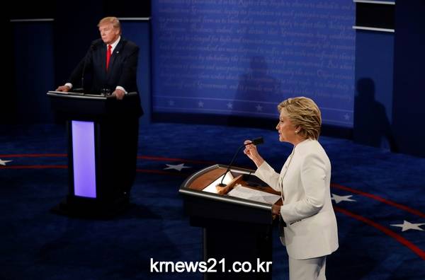 ▲ 미국 네바다 주(州) 라스베이거스 네바다 대학에서 10월19일(현지시간) 열린 제3차 TV토론에서 발언하고 있는 힐러리 클린턴 민주당 대선후보(오른쪽). 왼쪽은 도널드 트럼프 공화당 대선후보 MARK RALSTON / AFP[제공자ⓒ 뉴스21통신. 무단전재-재배포 금지.]미국 대선을 21일(현지시간) 앞두고 힐러리 클린턴 민주당 대선후보와 도널드 트럼프 공화당 대선후보가 19일 마지막인 3차TV 토론에서 격돌했다.