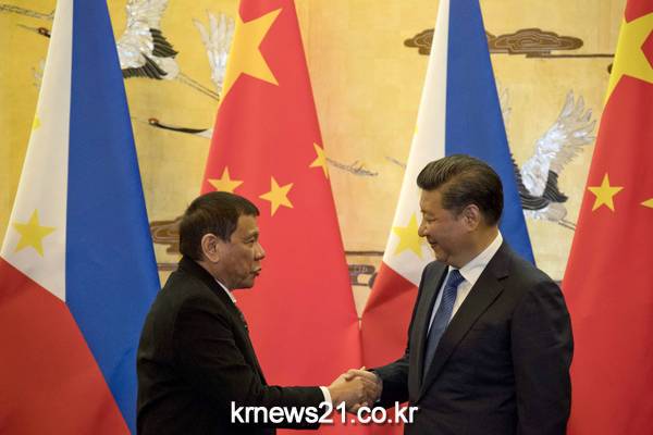 ▲ 중국을 방문중인 로드리고 두테르테 필리핀 대통령(왼쪽)이 20일 시진핑 국가주석과 정상회담을 위해 만났다. POOL / AFP [제공자ⓒ 뉴스21통신. 무단전재-재배포 금지.]나흘간의 일정으로 중국을 방문중인 로드리고 두테르테 필리핀 대통령이 20일 시진핑 중국 국가주석과의 정상회담 후 오랜 동맹국인 미국과의 결별을 선언했다.