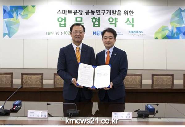 혁신적인 친환경 기술력과 윤리 경영을 바탕으로 하는 세계적 전기전자 기업, 지멘스의 한국법인 한국지멘스(대표이사·회장 김종갑, www.siemens.co.kr)는 전자부품연구원(KETI)과 국내 스마트 공장 분야 공동 연구개발(R&D)을 위한 양해각서(MOU)를 체결했다고 21일 밝혔다. 협약식에는 김종갑 한국지멘스 대표이사/회장, 박청원 전자부품연구원장 등 양사 임직원들이 참석했다.