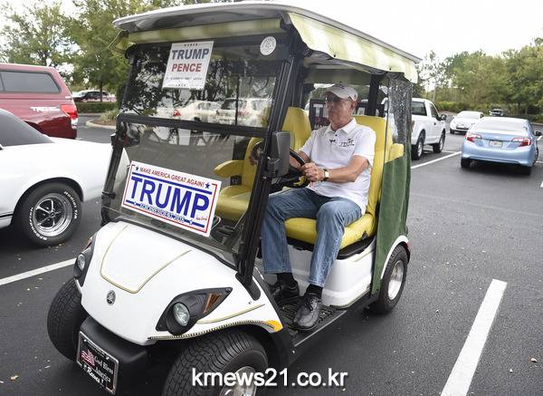 ▲ 미국 플로리다 주 `빌리지`에 살고 있는 은퇴자가 트럼프와 펜스 기호로 장식된 콕프 카트에 앉아 있는 모습. RHONA WISE / AFP[제공자ⓒ 뉴스21통신. 무단전재-재배포 금지.]미국 플로리다 주 섬터카운티(Sumter County)에 속하는 '빌리지' 주민 대다수는 은퇴 후 따뜻한 기후를 찾아 온 노인들이다.
