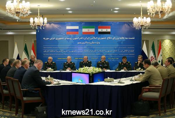 ▲ 이란 테헤란에서 지난 2016년 6월 9일(현지시간) 시리아 사태 논의를 위해 회동한 러시아·이란 국방장관 HO / IRANIAN DEFENCE MINISTRY / AFP[제공자ⓒ 뉴스21통신. 무단전재-재배포 금지.]모하마드 자바드 자리프 이란 외무장관이 시리아 상황에 대해 시리아 정부와 러시아 등 3개국과 회담을 위해 28일(현지시간) 모스크바로 향한다고 이란 외무부가 밝혔다.