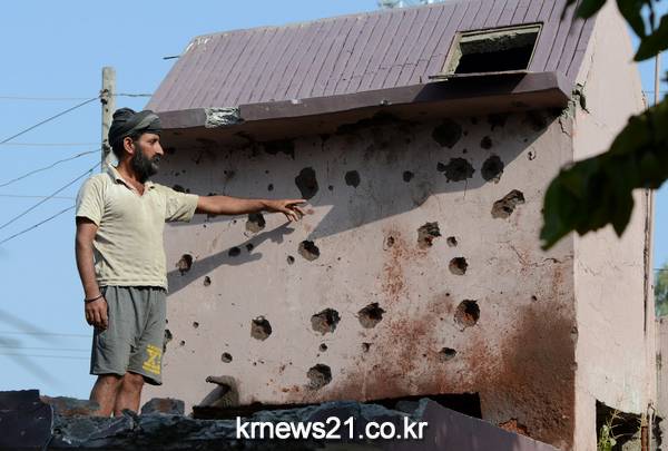 ▲ 인도 최서북부 잠무·카슈미르 주에서 약 25km 떨어진 국경지역 마을에서 10월24일(현지시간) 한 인도 주민이 파키스탄과의 총격전으로 손상된 건물 벽을 가리키고 있다. [제공자ⓒ 뉴스21통신. 무단전재-재배포 금지.]파키스탄과 카슈미르 지역을 두고 갈등을 빚고 있는 인도가 파키스탄 대사관 직원 한 명을 '스파이 혐의'로 추방했다고 인도 외교부가 밝혔다.