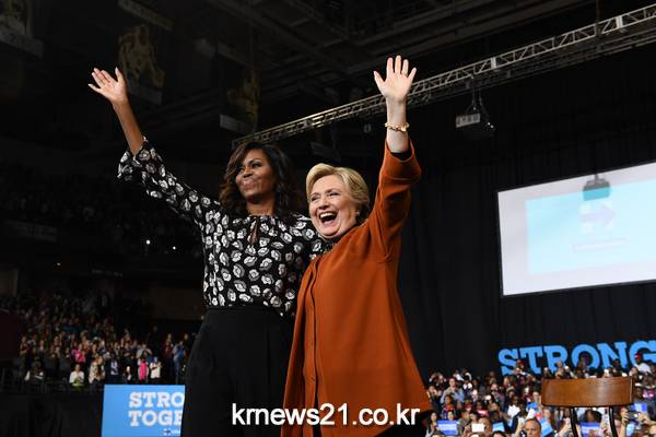 ▲ 미국 노스캐롤라이나에서 27일(현지시간) 미셸 오바마 여사(왼쪽)이 힐러리 클린턴 민주당 대선후보와의 첫 공둥 유세를 펼쳤다. Jewel SAMAD / AFP[제공자ⓒ 뉴스21통신. 무단전재-재배포 금지.]버락 오바마 대통령의 부인인 미셸 오바마 여사가 27일(현지시간) 힐러리 클린턴의 유세 현장에서 첫 공동 유세를 펼쳤다.