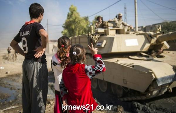 이라크 모술에서 이라크 정부군이 일부 마을 재탈환 한 후 아이들이 브이를 그리며 이들을에게 인사하고 있다.