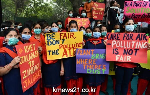 인도 뉴델리에서 대기 오염을 줄이기 위한 즉각적인 조치를 촉구하며 보호 마스크를 착용한 시위자들. 뉴델리에서는 6일(현지시간) 심각한 대기오염에 따른 '비상사태'를 선포했다.