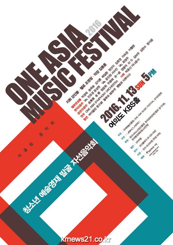 ▲ 올해 새롭게 출범한 국제예술진흥원과 원 아시아 뮤직 페스티벌 조직위원회가 아시아 각국의 클래식 아티스트들이 한자리에 모이는 화려한 음악회를 마련했다(사진제공: 예술배달부)청소년 예술영재 발굴 자선음악회 원 아시아 뮤직 페스티벌(ONE ASIA MUSIC FESTIVAL)이 13일(일) 오후 5시 여의도 KBS홀에서 열린다.