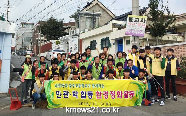 이번 민·학·관 환경정화활동은 재개발지역이 대부분인 우리동네를 내 집처럼 깨끗이 정리하자는 목표로 사회단체, 광주고 학생, 공무원 등 60여명이 함께 참여하여 푸른길 주변 정리, 쓰레기 상습 투기지역 청소 등 환경정비를 추진하였다.