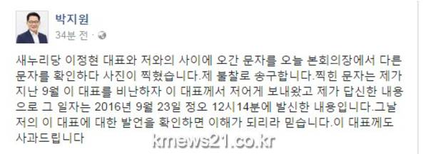 이어 "찍힌 문자는 제가 9월 이대표를 비난하자 이 대표께서 저에게 보내왔고 제가 답신한 내용으로는 그 일자는 2016년 9월 23일 정오 12시 14분에 발신한 내용"이라고 설명했다.