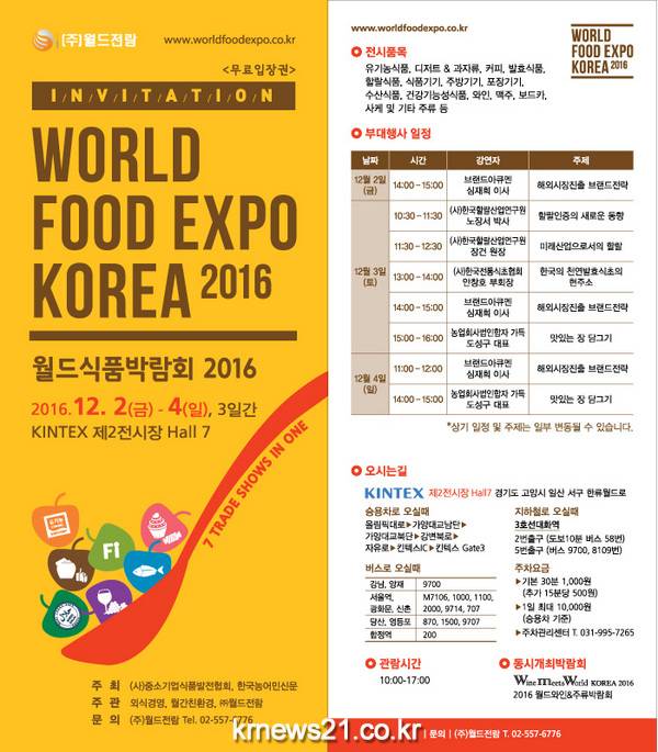 한파주의보가 전국으로 확대되면서 추위가 기승을 부리고 있는 가운데, 추위마저 잊게 만들 ‘월드식품박람회2016’이 12월 2일부터 4일까지 일산 킨텍스에서 3일간 개최된다.
