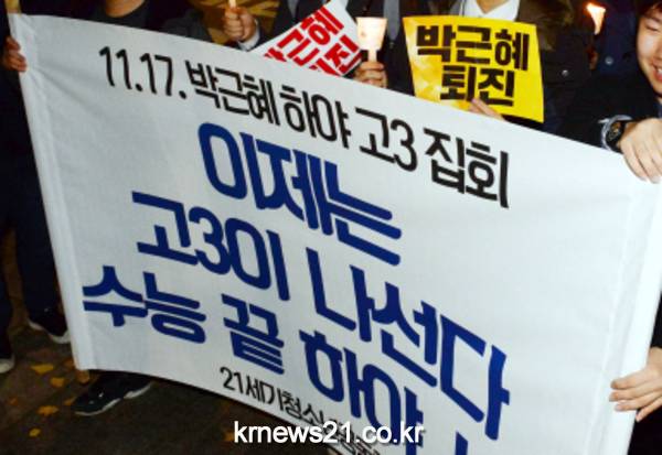 수험생들은 "대한민국의 주인은 국민입니다"라며 외쳤다. 최근 논란이 되고 있는 국정농단 사태에 분노한 고3 수험생들이 수능이 끝나자마자 거리로 나온 것이다.