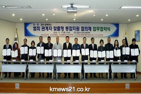 진도경찰서(서장 강성희)에서는 11월 17일 14:00경 진도경찰서 본관 4층 보배마루에서 진도경찰서, 진도군청, 농협중앙회 진도군지부, 목포 고용복지 플러스센터, KOVA 전남지부, 청예단 전남지부, 전남서부 노인전문기관, 진도 노인복지관(이랜드복지재단), 진도군 다문화가족지원센터, 쌍계사, 정경일 법률사무소, 첫마음심리상담센터, 울림기자 협회, ㈜청진개발, 중앙의원, 정현빌딩, 진모씽크 총 17개 기관(단체)이 참여하여 민·관·경이 함께하는 범죄관계자 맞춤형 통합지원단 업무협약식 행사가 이뤄졌다.