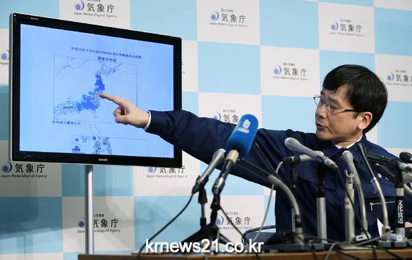 ▲ 나카무라 코지 일본 기상청 당국자가 지난 22일 발생한 규모 6.9 강진 이후 브리핑을 하고 있는 모습. JIJI PRESS / AFP[제공자ⓒ 뉴스21통신. 무단전재-재배포 금지.]지난 22일 규모 6.9의 강진이 일어난데 이어 이틀 후인 24일 후쿠시마에서도 규모 5.6의 지진이 발생했다.