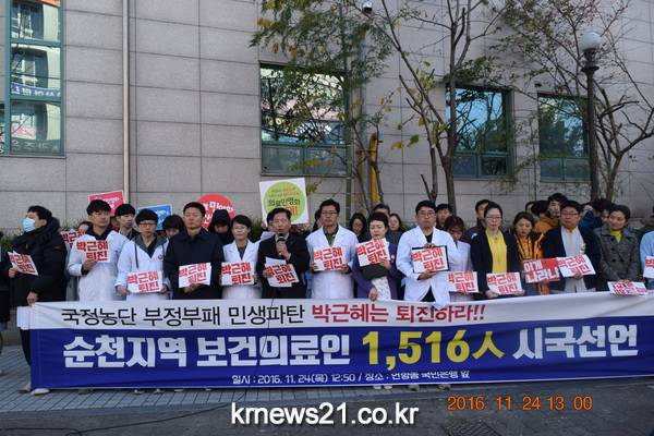 대한민국은 민주공화국이며 모든 주권은 국민으로부터 나온다. 순천지역 보건의료 종사자들은 국민이 행복한 나라, 국민이 주인되는 나라를 만들기 위해 더 이상 침묵하지 않을 것이다. 우리는 국민의 건강과 생명을 위해 의료의 공공성을 지키고, 국민 누구나 병원비 걱정없이 치료받을 수 있는 사회를 만들기 위해 박근혜 퇴진투쟁에 나설 것을 선언한다.