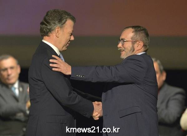 후안 마누엘 산토스 산토스 콜롬비아 대통령과 콜롬비아 최대 반군인 콜롬비아무장혁명군(FARC)의 지도자 로드리고 론도뇨(일명 티모첸코)는 이날 수도 보고타의 콜론 극장에서 새로운 평화협정에 서명했다.