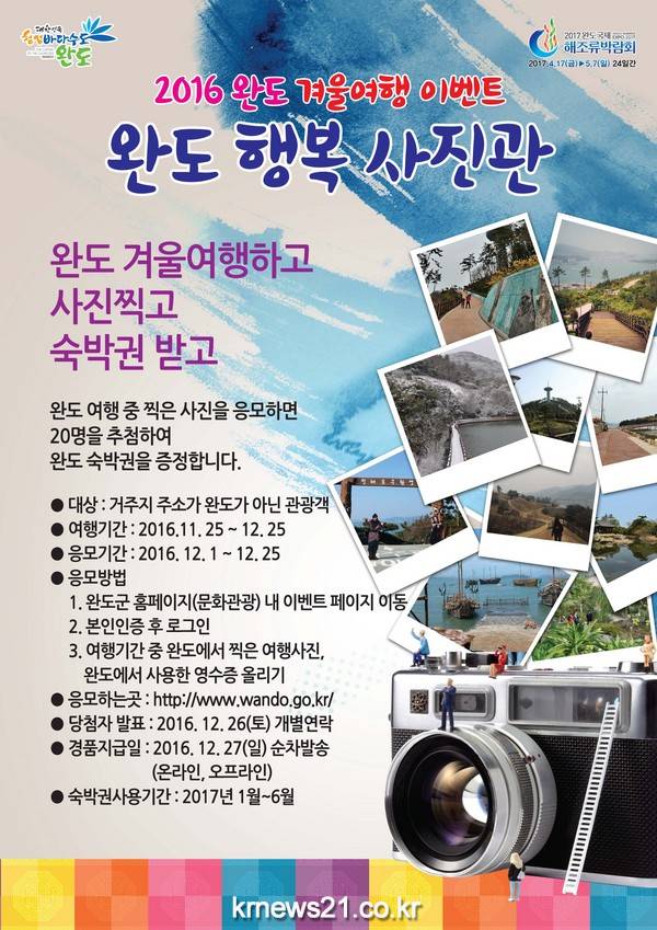 완도군은 겨울 비수기 관광객 유치를 위해 ‘2016 완도 겨울여행 이벤트’를 개최한다고 밝혔다.